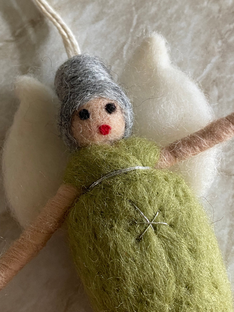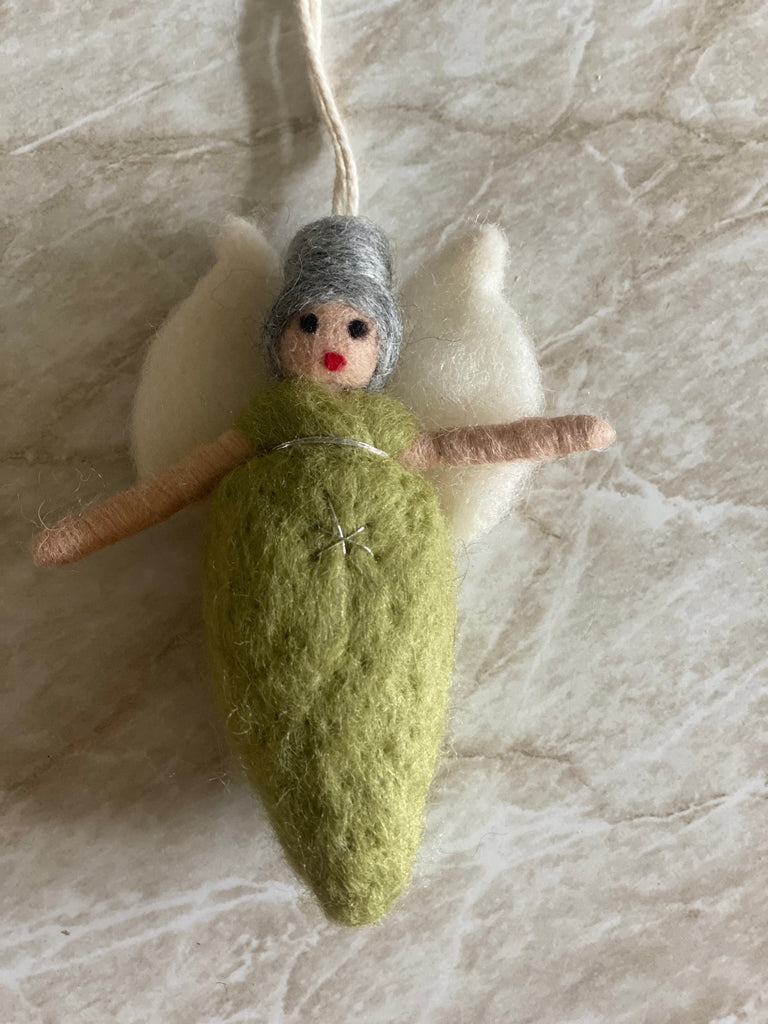 Dit is een schattig engeltje. Gemaakt van wilvilt. In een prachtige kleur linde groen. Met zilverdraad heeft ze kleine details. Superleuk om op te hangen in de kerstboom of aan je kastdeur of wat een mooie krans. Ze is gewoon heel erg leuk.