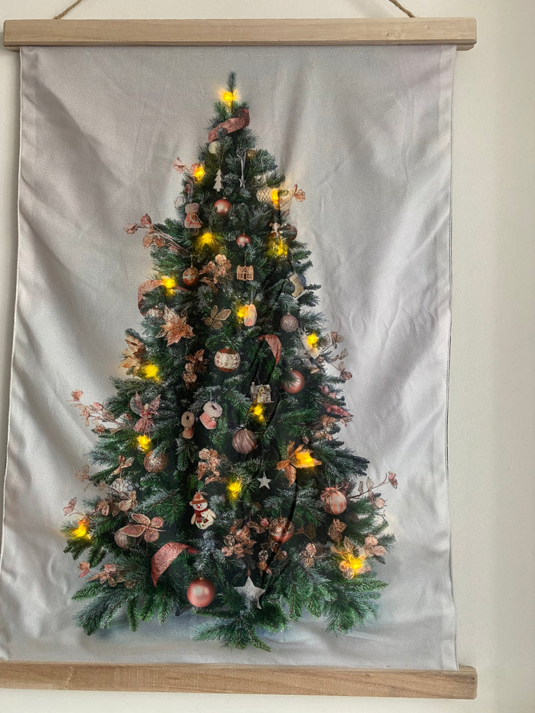 Super leuk deze boom! Breng warmte in huis met deze sfeervolle kerstboom op fluweel. Voorzien van subtiele LED-verlichting, werkt op 2 AA-batterijen (niet inbegrepen). Perfect om op te hangen aan muur, deur of raam .