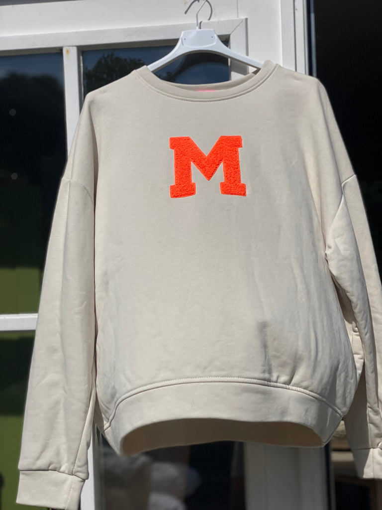 Beige van kleur, de letter M ligt er een beetje boven op, in een prachtige oranje kleur.
