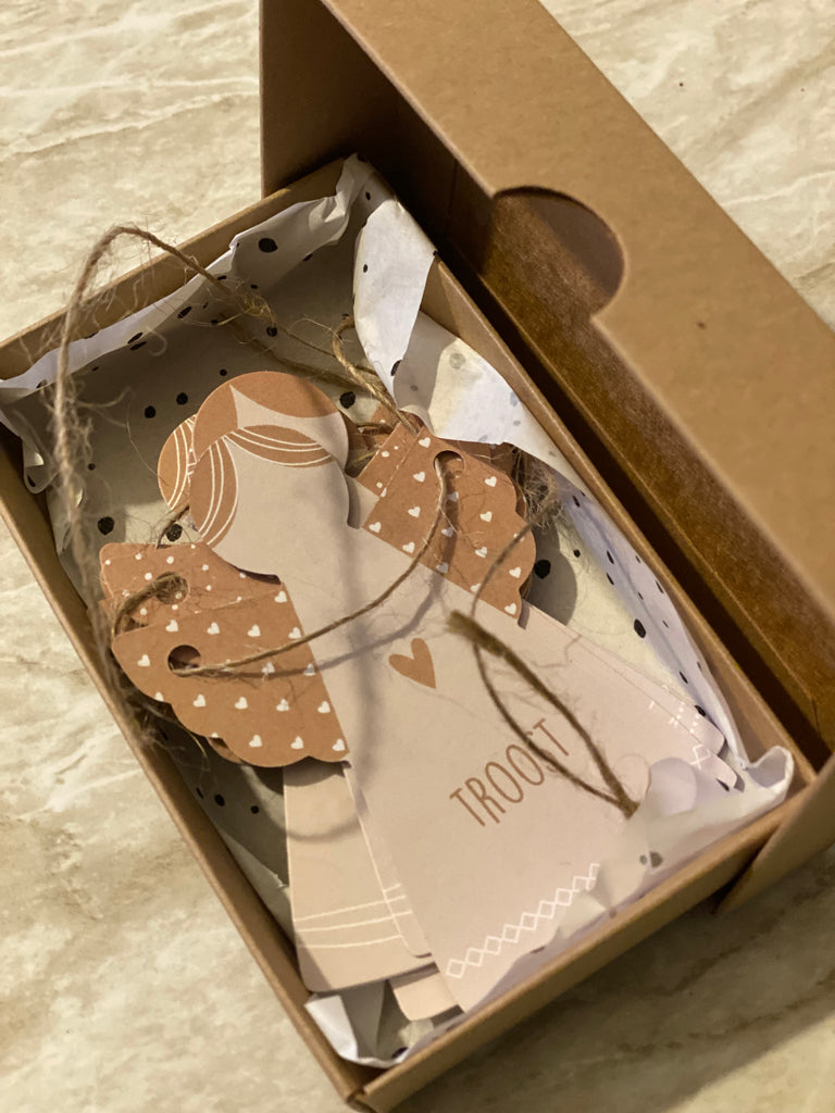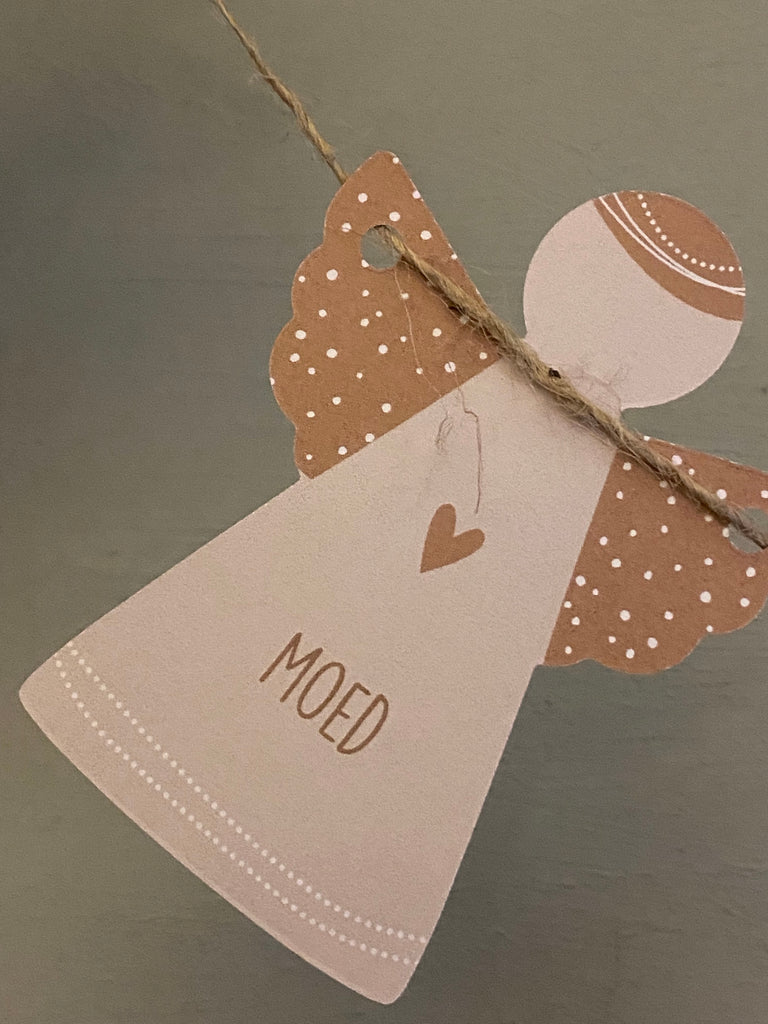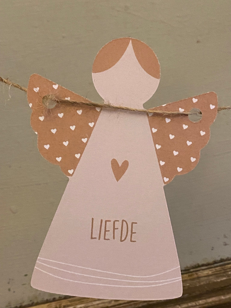 Prachtige woorden, als troost/ vriendschap/ moed/ liefde etc op een engeltje, deze papieren engelen hangen als een slinger, met sisal draad.