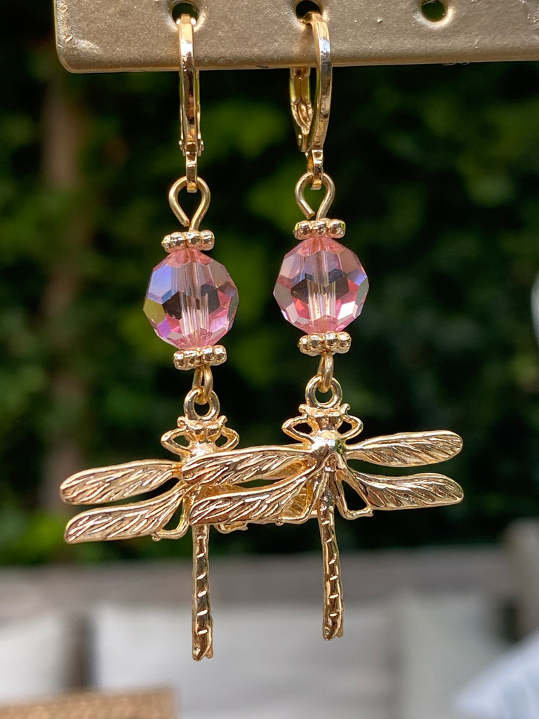 Oorbellen met libelle 24 K goldplated en swarovski crystal roze