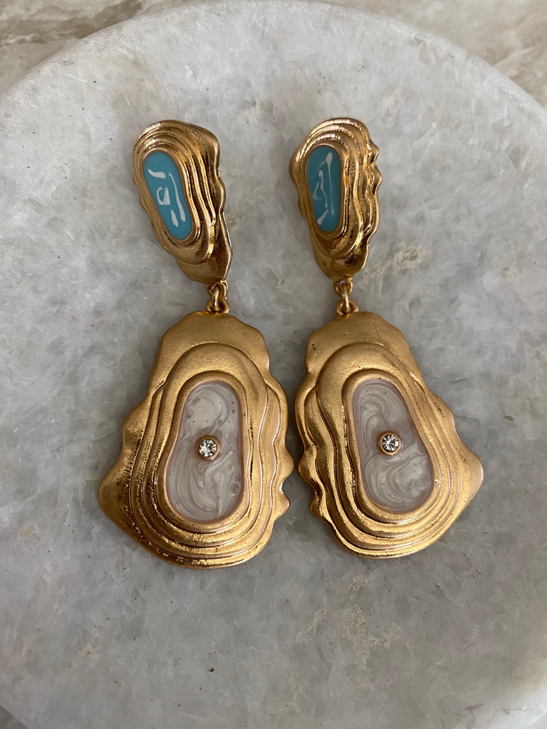 Bijzondere oorbellen, goudkleurig met parelmoer, blauw en en gebroken wit.