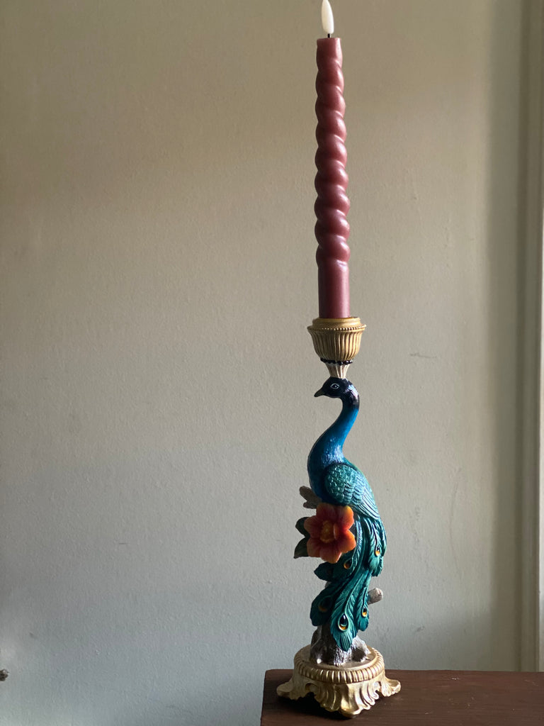 Peacock kandelaar met prachtige, levendige kleuren. Draagt met trots elke kleur kaars. Hoogte: 29 cm.